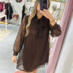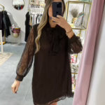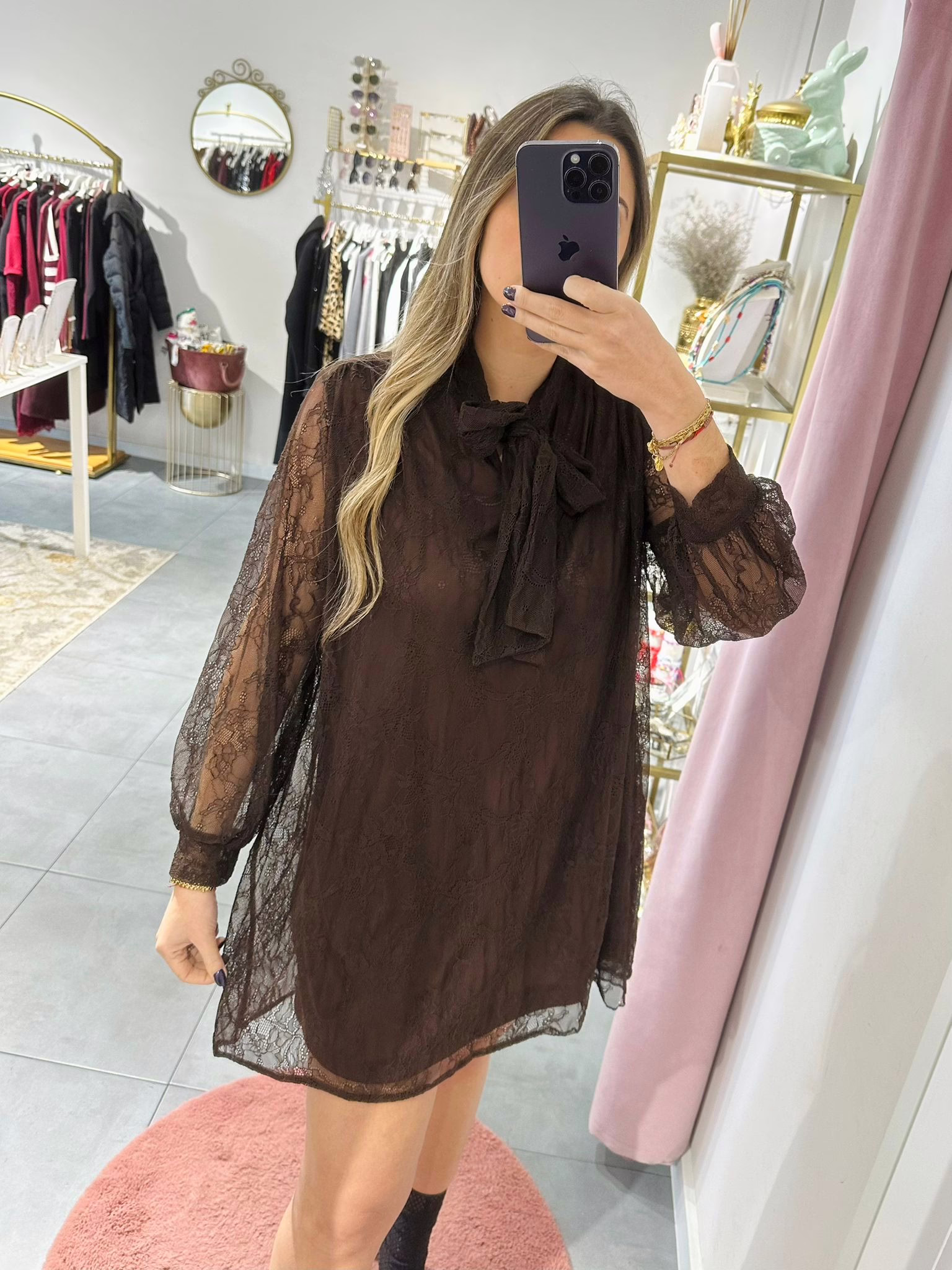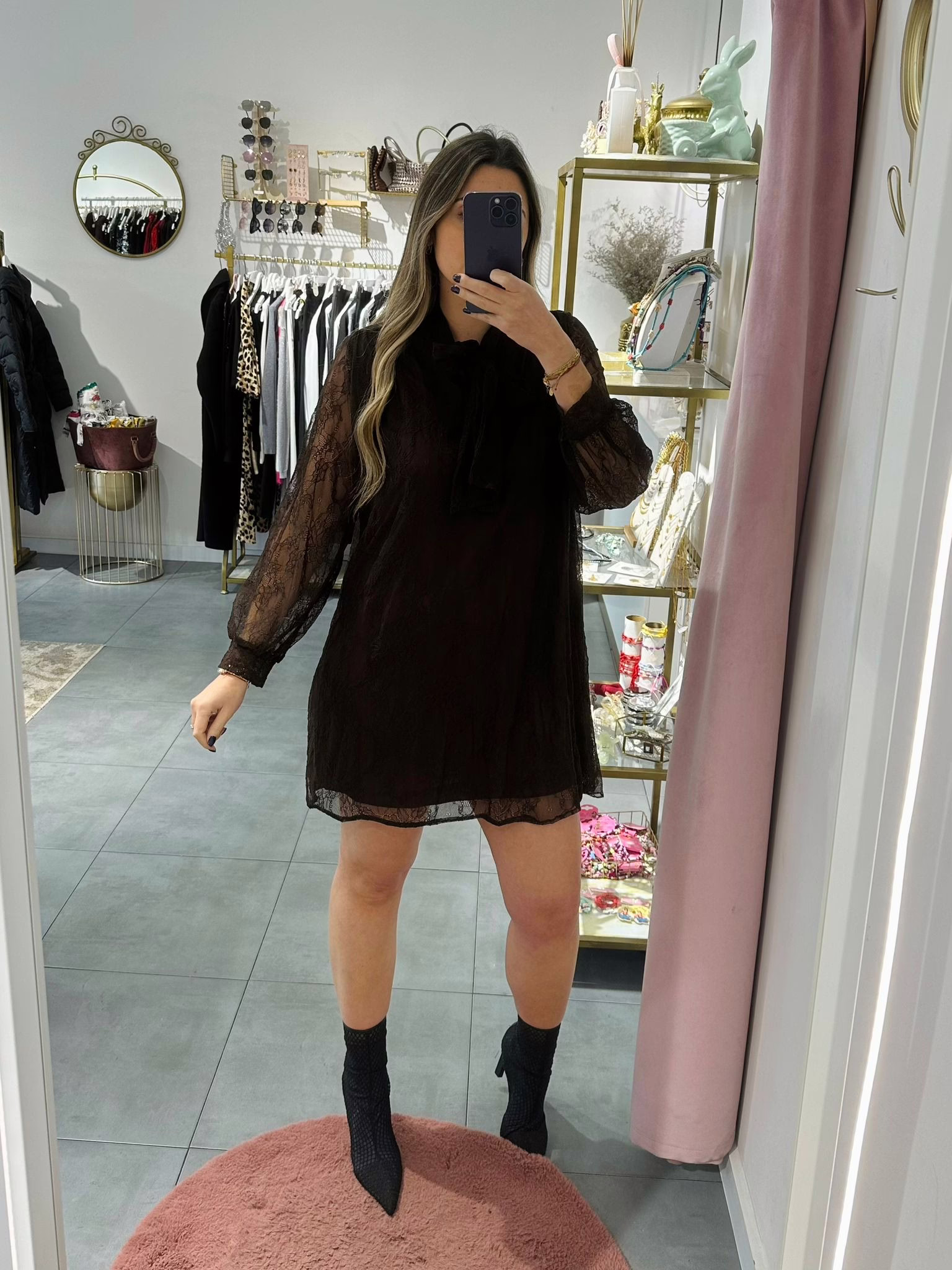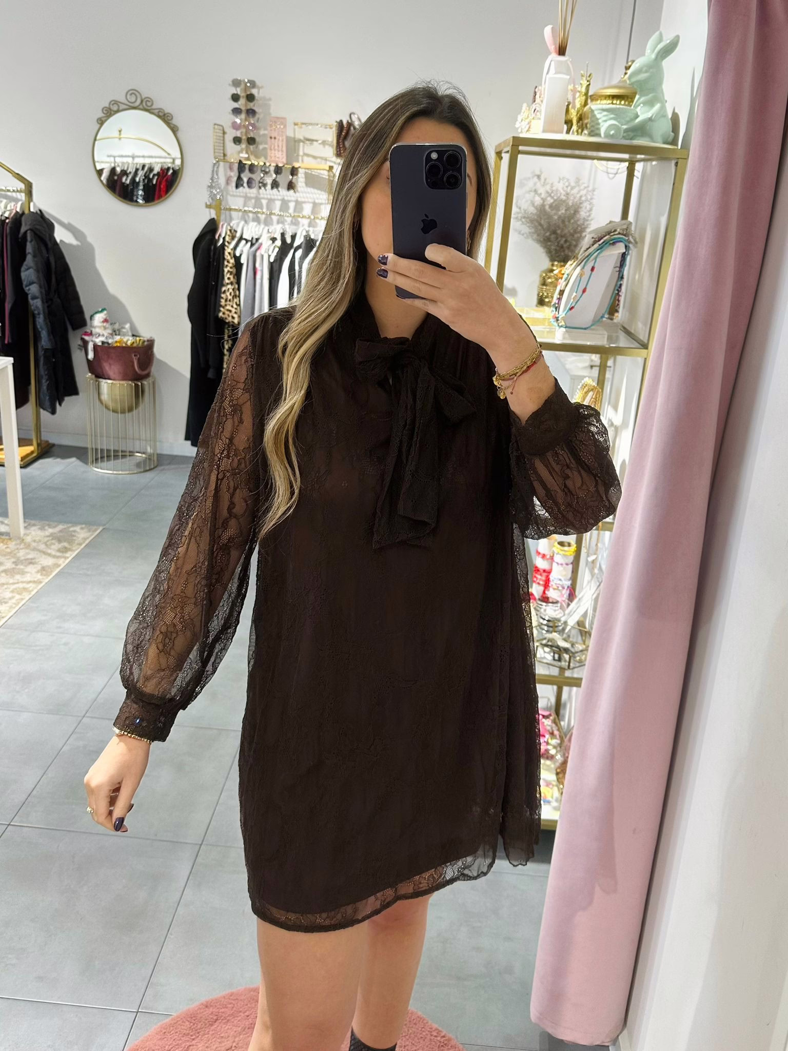 Vestido curto em renda com forro, aperta com laçado no pescoço.