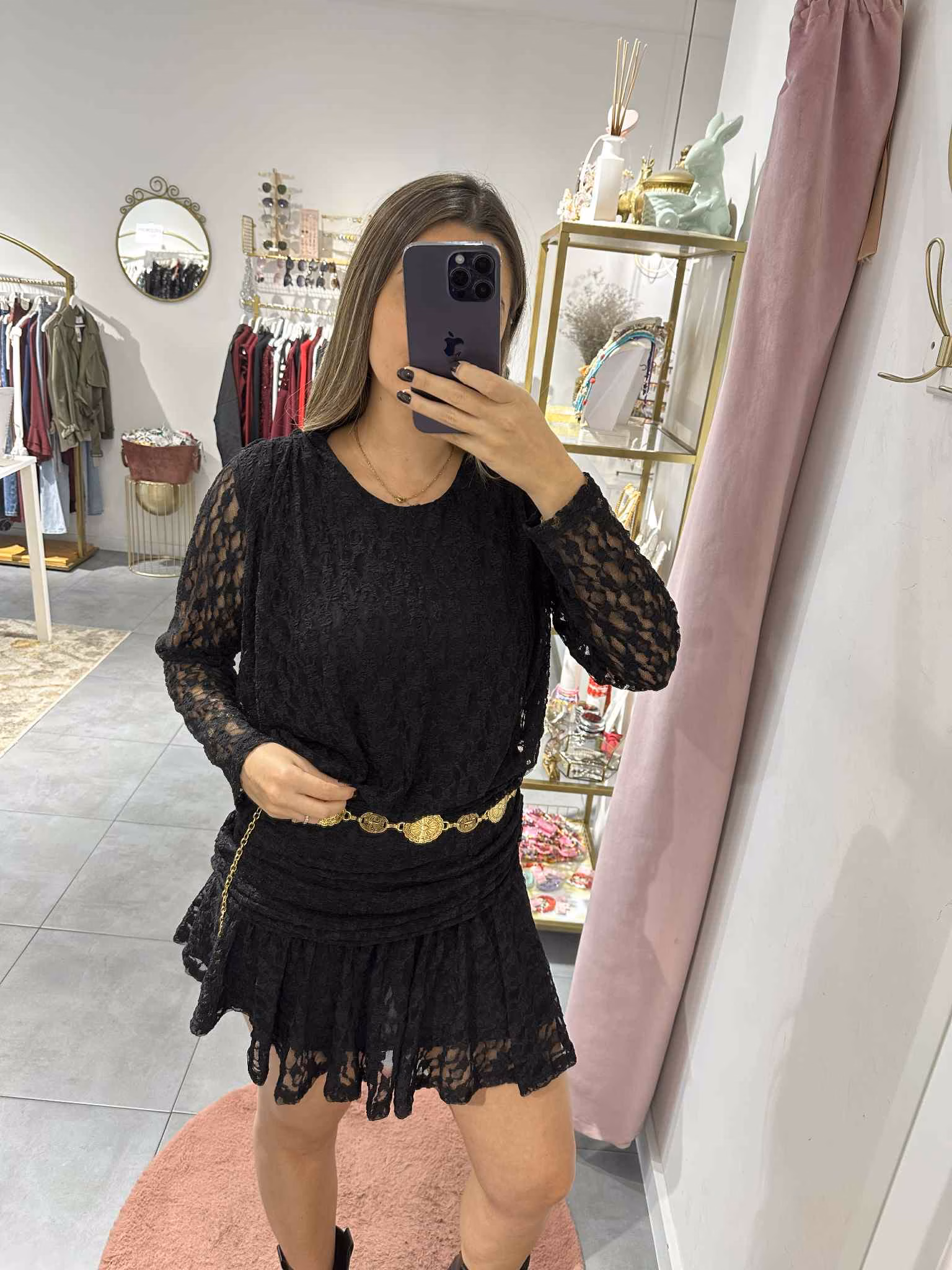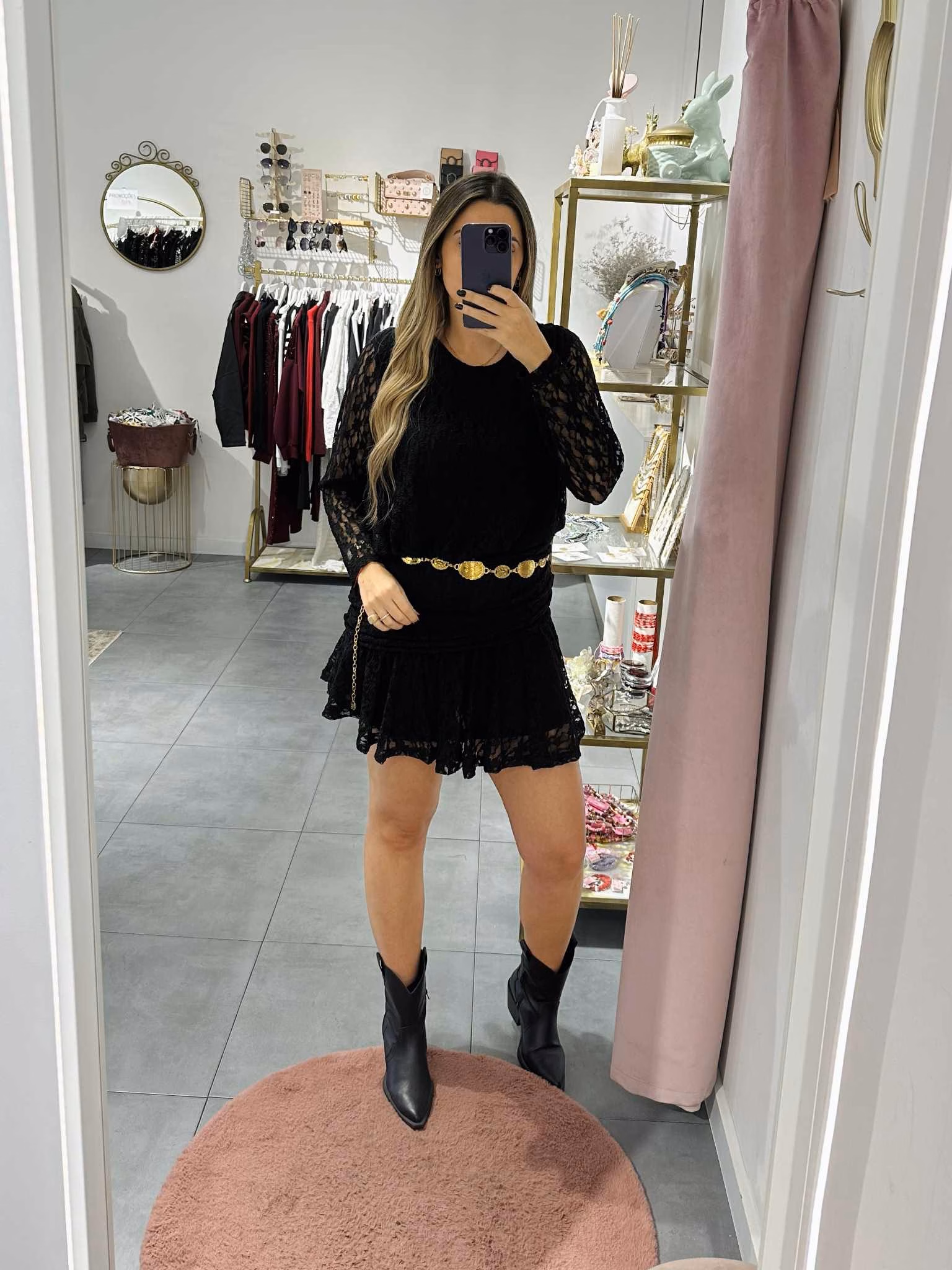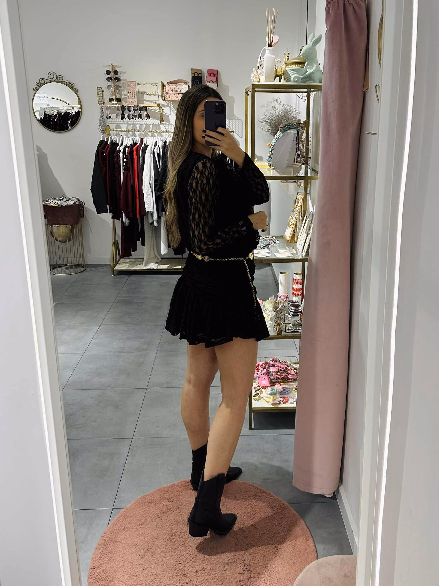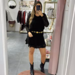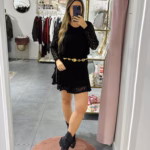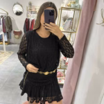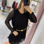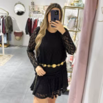 Vestido curto, largo na parte de cima e cintado na zona da anca.