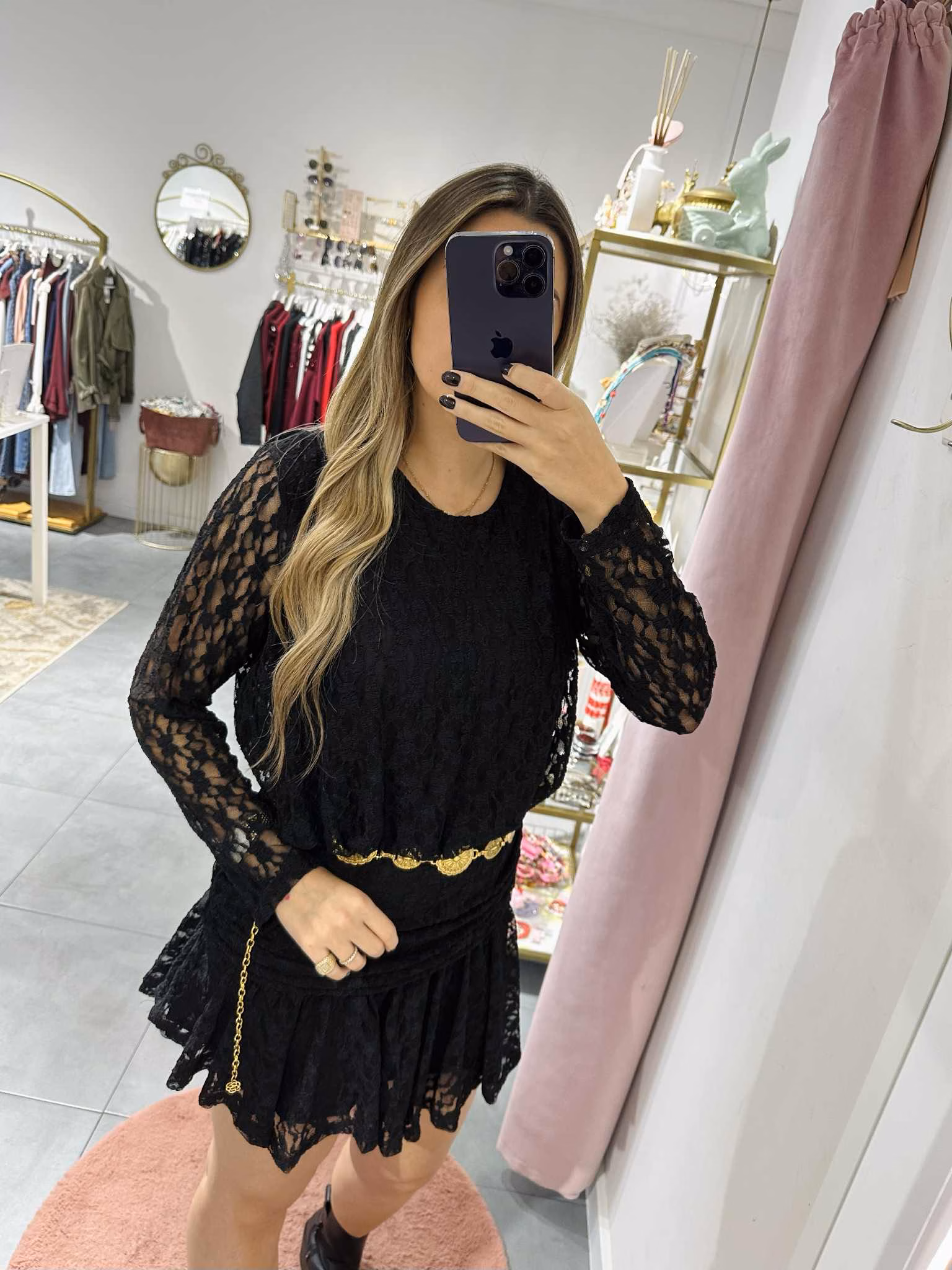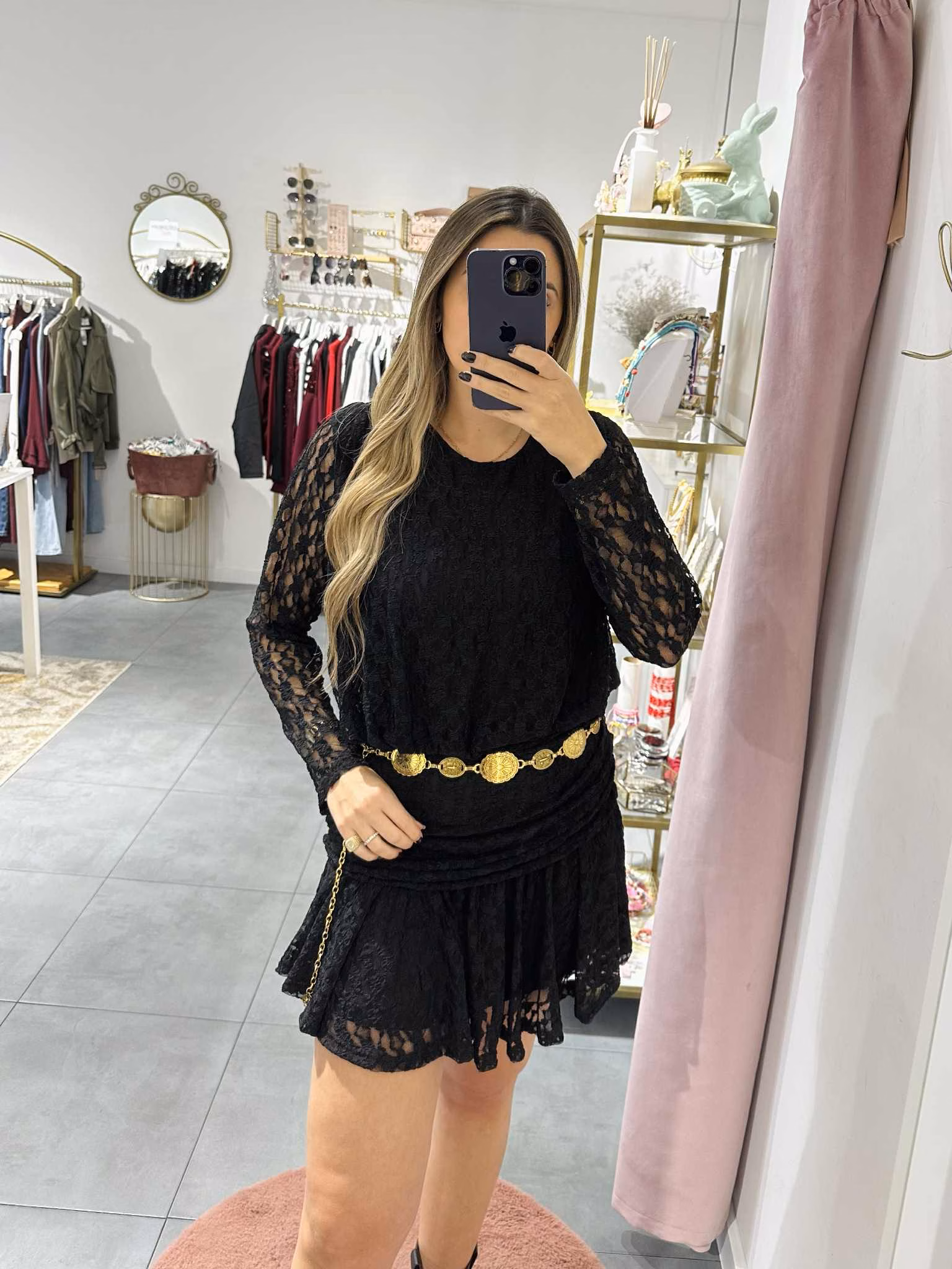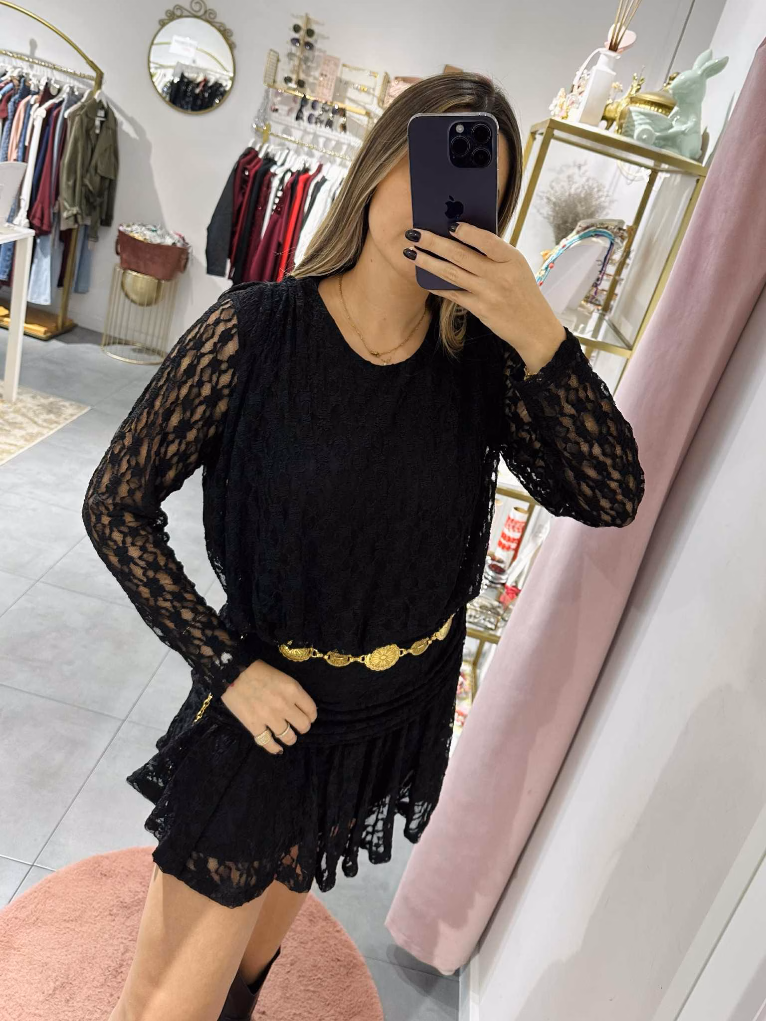 Vestido curto, largo na parte de cima e cintado na zona da anca.