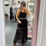 A modelo tem 1,73m e veste o tamanho M/L parte de cima e um 38/40 de parte de baixo.