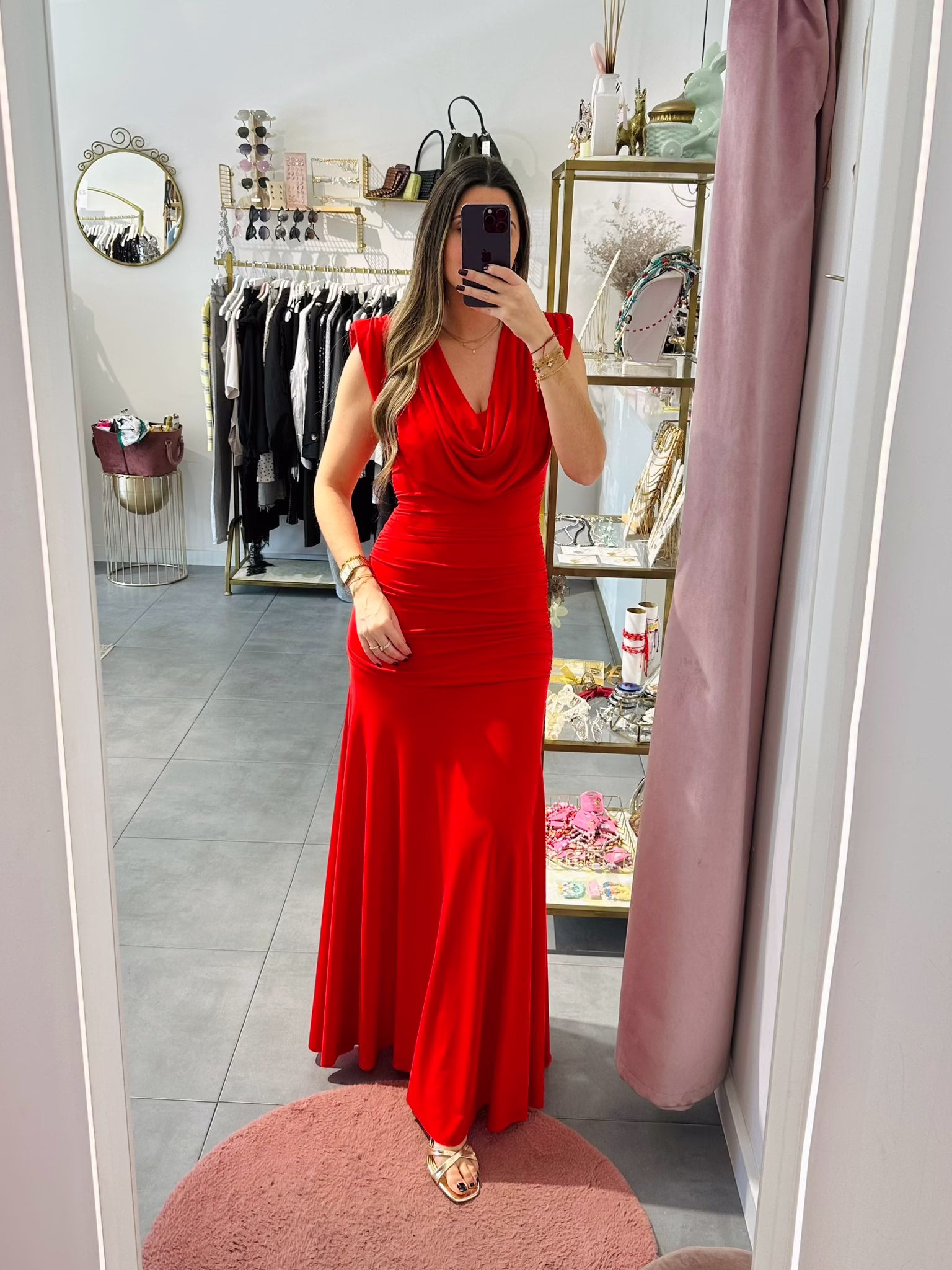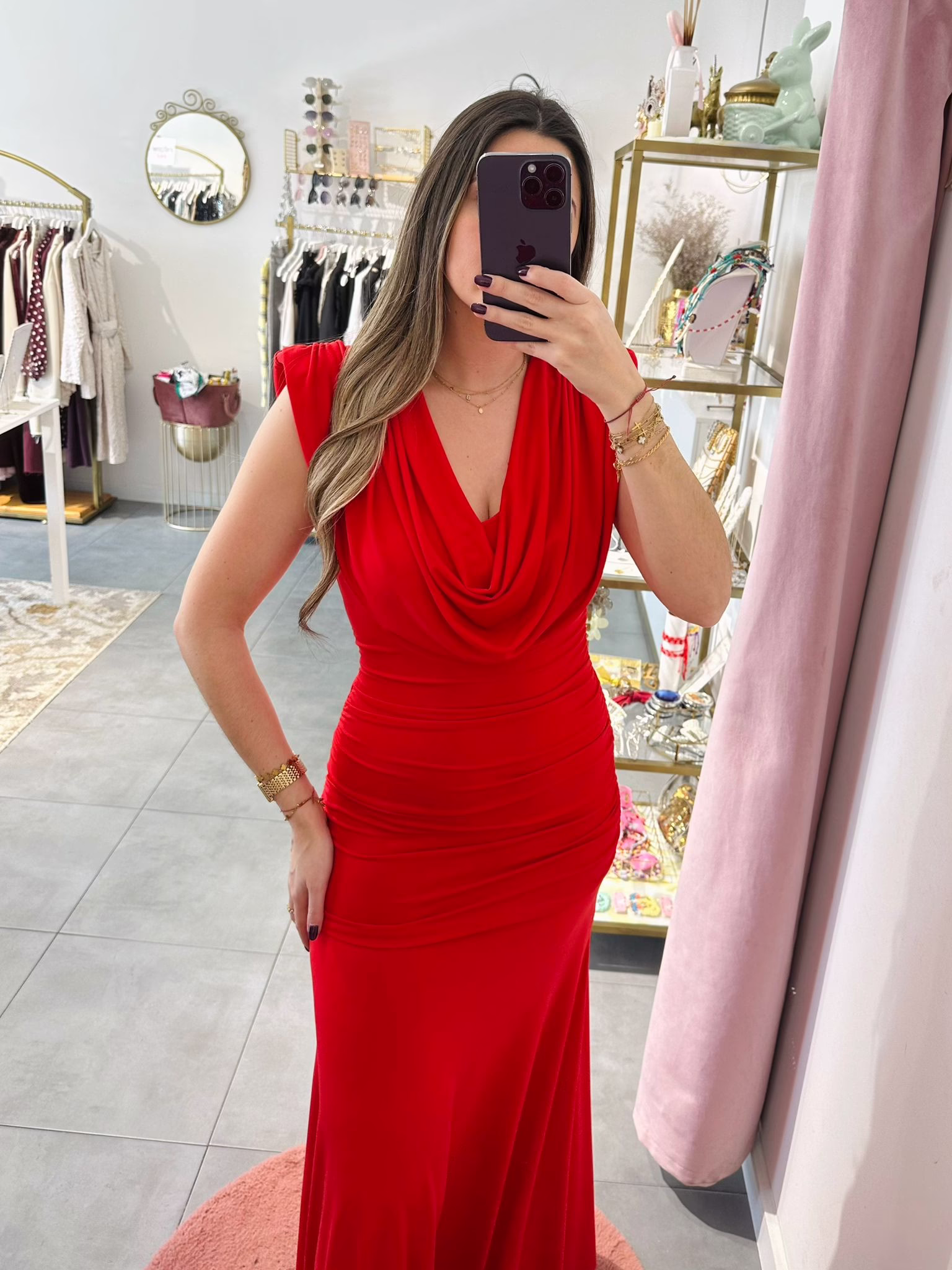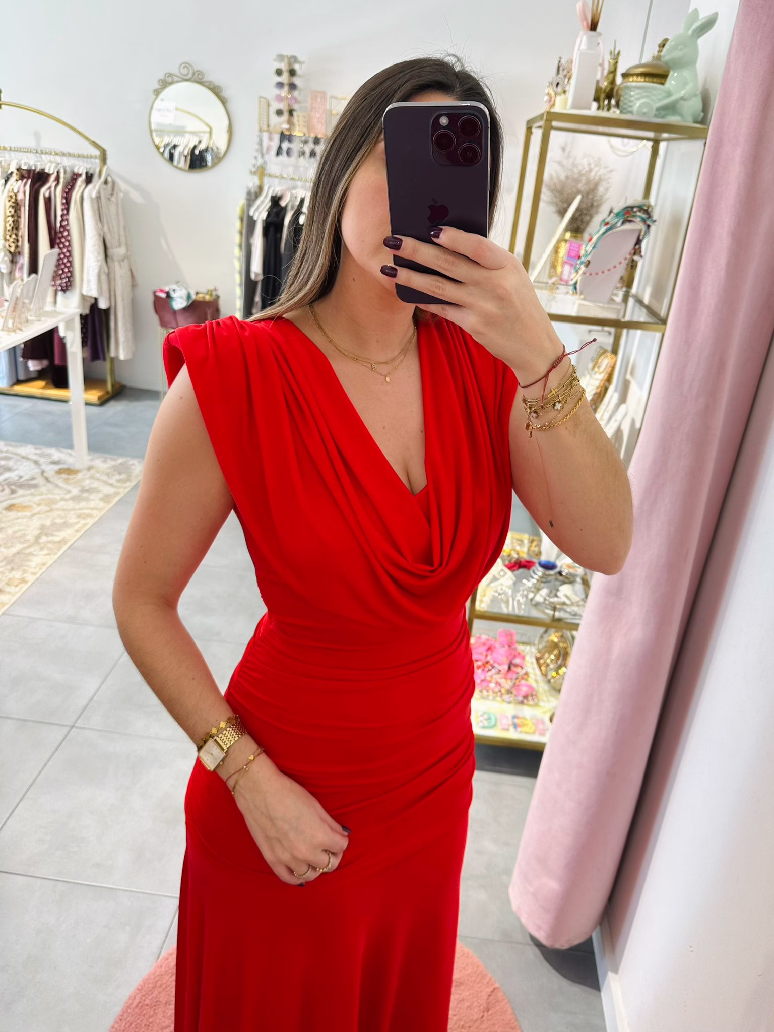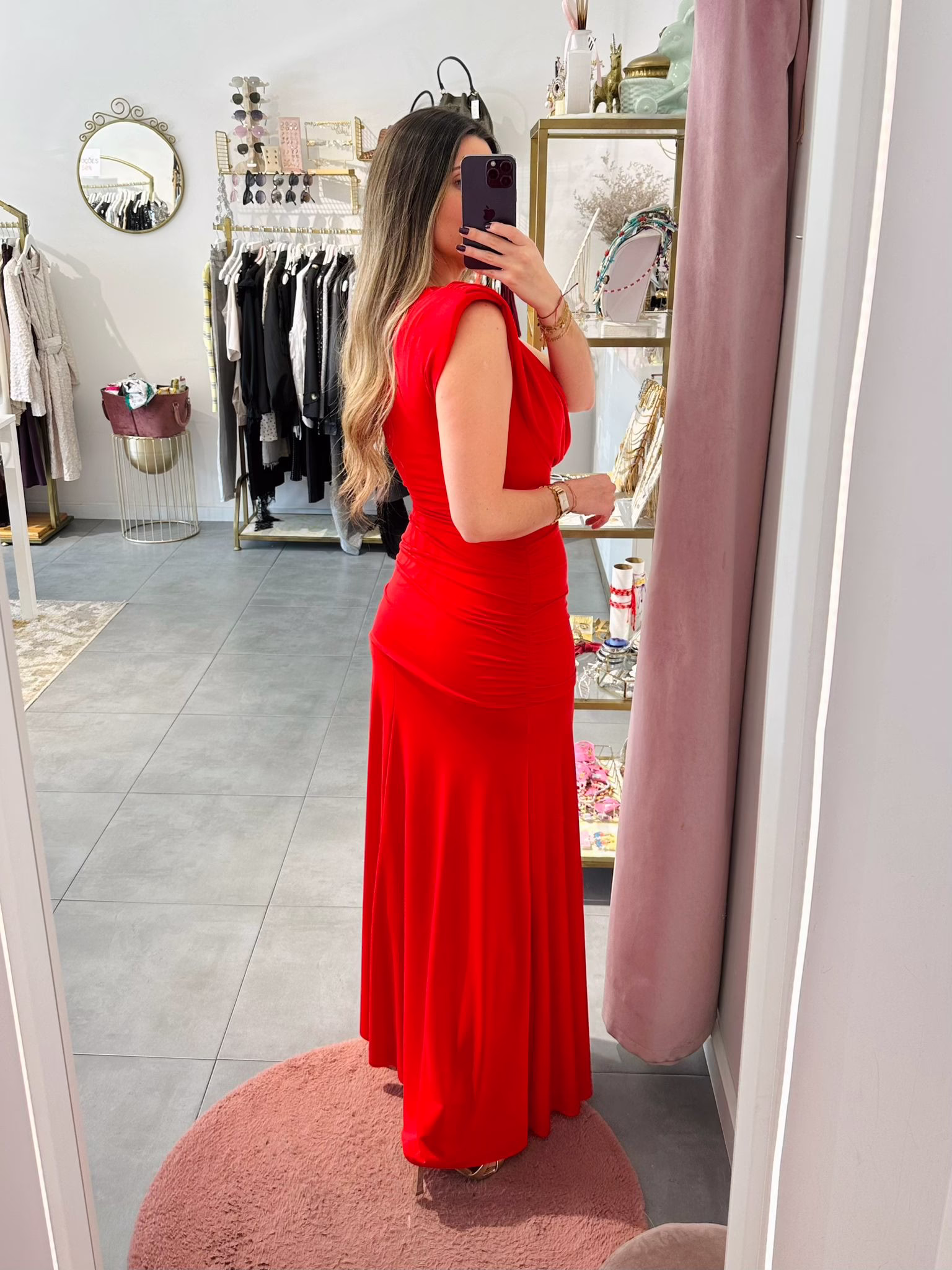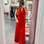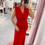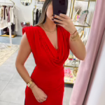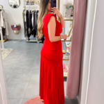 Vestido em malha de lycra vermelho, tem ombreiras.